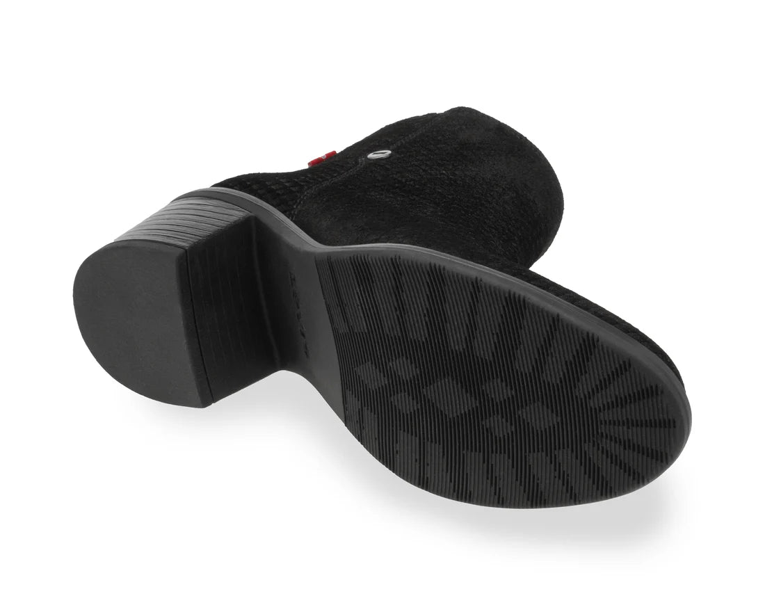 Bota con inspiración western en piel gamuza con grabado de escama de serpiente. Ajuste sencillo gracias al cierre lateral. Incluye forro sintético, plantilla de carnaza de cerdo natural con laminado de EVA para una sensación acolchada, y suela de TR de tacón bajo con textura antiderrapante para una mayor seguridad al caminar.